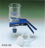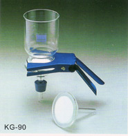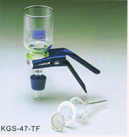 減壓過濾器 Vacuum Filter Holders | 編號 | 過濾膜 | 預濾紙 | 有效過濾面積 | 杯子容量 | | KGS-04 | ∮13或25mm | -- | 0.13cm2 | 100ml | | KG-25 | ∮25mm | ∮16mm | 2.10cm2 | 20ml | | KGS-25 | ∮25mm | ∮16mm | 2.10cm2 | 20ml | | KG-47 | ∮47mm | ∮35mm | 9.60cm2 | 300ml | | KGS-47 | ∮47mm | ∮35mm | 9.60cm2 | 300ml | | KGS-47-TF | ∮47mm | ∮35mm | 9.60cm2 | 300ml | | KG-90 | ∮90mm | ∮70mm | 43.0cm2 | 1000ml | | KGS-90 | ∮90mm | ∮70mm | 43.0cm2 | 1000ml |