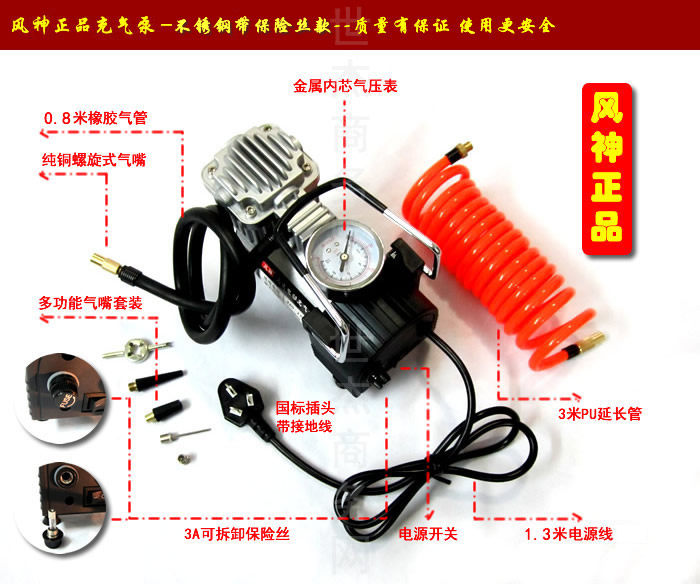 2、气流量30L/分钟,金属30MM加大气缸,0.8米充气管,适用汽车轮胎及球类、气床等。
