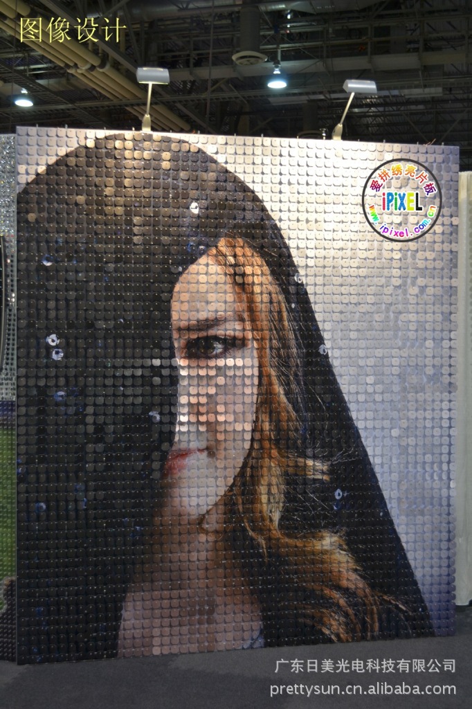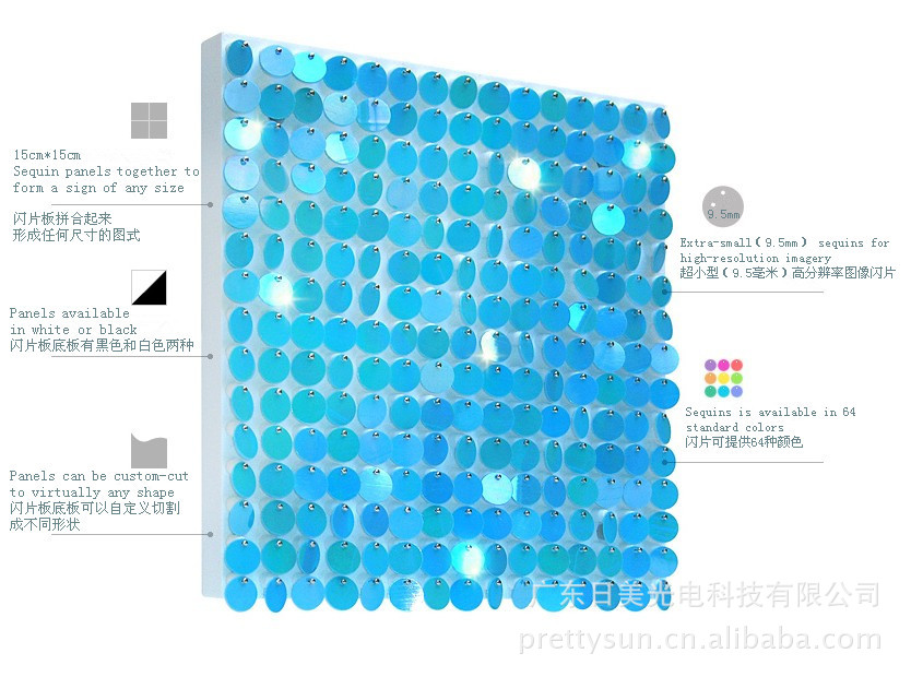每片产品规格:150mm×150mm, 每片板材由225块小颗圆形亮片组成。300mm*300mm ,每片板材由100块小颗圆形亮片组成共有64款花色可以设计师编排订制。应用于户外户内招牌,广告牌,舞台背景墙展示,节庆日、主题公园和游乐场特色景点,贸易展,零售窗口附属支架,图像设计,建筑设计等。图片为实物拍摄,一流的技术,独具风格,不仅有多款颜色,还可以任意搭配,自由选择,展现您的无限创意,我们将以专业的服务品质,为您提供诚心的服务保证。
