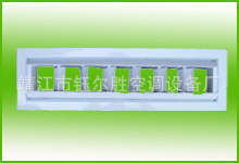 风口具有矩形外框结构,在外框内套装鼓壳,鼓壳内装有联动的流线形活动叶片。鼓壳可沿水平轴在俯仰方向进行±30°角范围的调整。联动叶片可在水平方向进行±45°角范围的调整。以改变送风的方向。调整方便。在风口后部可配装风量调节阀(OBD)以调整进风量。