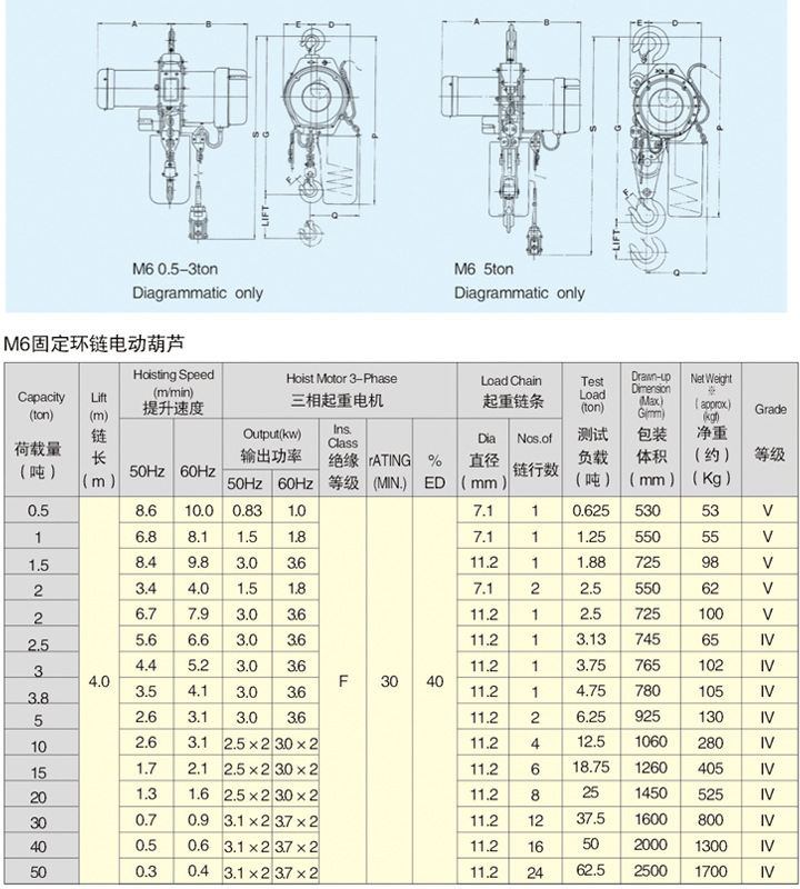 M6一Y型环链电动葫芦具有起升和下降的功能.同时还具备安全快速左右行走功能。M6一Y型0.5吨一10吨的运行小车的轮距可以通过拆装运行小车上的垫圈来适应不同尺寸的工字梁.所适合的工字钢尺寸请参照右侧的数据表。下拉式锻造碳钢小车轮轻过精密的热处理,并由高质防摩擦轴承提供顺畅稳定的运行。(小车运行速度分为单速和双速两种)