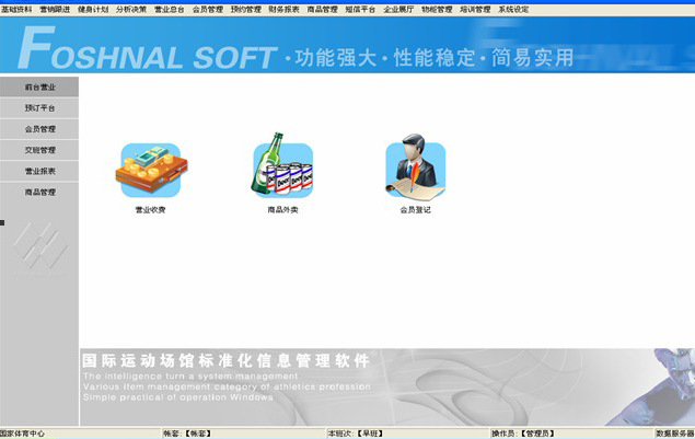 佛盛龙体育场馆管理系统(标准版) V9 ――提供了集成的羽毛球财务管理、人力资源管理、采购管理、分销管理、供应链管理、会员管理、商品管理、物柜管理、饮食管理平台等多个应用模块,并为球馆提供行业及个性化解决方案、移动商务解决方案,真正做到收银不能做假、会员轻松刷卡、让企业更形象的球馆电脑一体化管理平台。