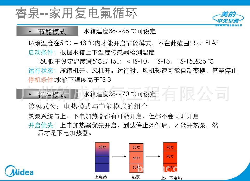 ♦节能模式:空气能制热水模式,水温可以加热到65℃,环境温度较高时(春季、夏季、秋季)推荐使用。