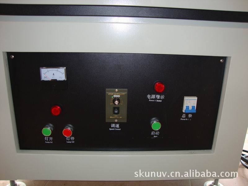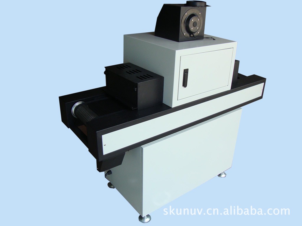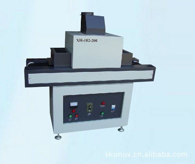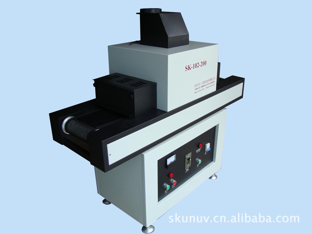 供应LED灯杯UV光固化机 ■型号:SK-102-200 ■适用范围:紫外线(UV)胶水、紫外线UV油墨、紫外线UV光油固化 以其体积小,经济实用为卖点,是众多从事小批量、试生产、小规格产品生产企业,以及涂料、胶水生产厂家研发、测试常备机型之一。 ■性能特点 ·十分轻便、体积小,单支UV光源,适合流水线单工位作业及非流水线式手工操作使用; ·操作方便,批量生产机型之一,所选组件均为标准化,操作及维护简单、使用成本低; ·采用国产优良品质UV光源,稳定性好; ·UV灯调节非常方便,只需在机台的两侧对称上下定位其位置即可,同步实现UV灯的高度调节; ·合理循环排风设计,整机冷却效果佳; ·采用无极调速方式,速度在有效范围内均可自由设定.
