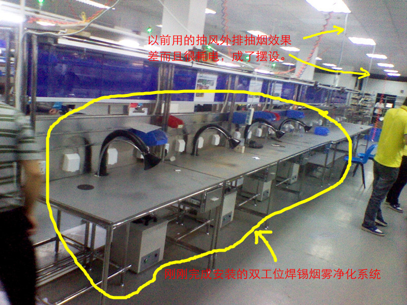 请看此图:某电子焊锡车间以前用吸烟仪(前面的),现在换成我公司的焊锡烟雾净化机,员工对效果露出真心的笑容O(∩_∩)O~。
