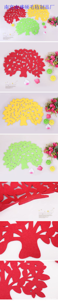 非常有创意的杯垫大树造型和颜色都透出大自然的气息采用耐磨的毛毡材质,可持久使用,能够充分隔热,保护桌子。给亲们一个小提醒哦,本杯垫不可以水洗,清洁时请用湿布擦拭,实用又好看的东西。
