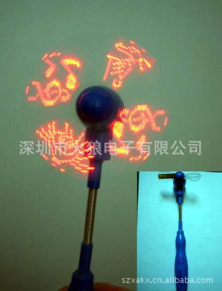 转动能闪出文字及简易的图案,风扇叶面内侧置7颗同色LED灯,如红或兰或绿等...闪出客人要求的LOGO,此产品非常适用于促销.赠送.节日活动用品,想想看歌迷.影迷们拥有一把能们出自已中意人名字的风扇,他们会不会更疯狂呢!