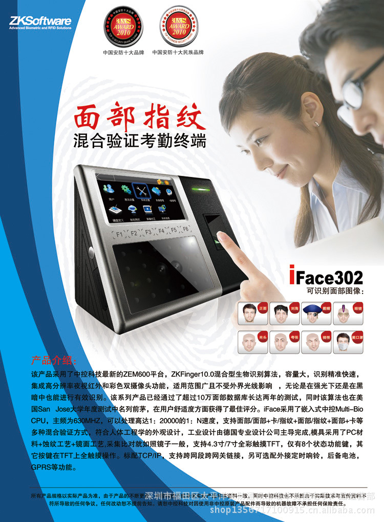 中控科技2009年8月推出iFace系列指纹、面部、RFID混合验证考勤门禁终端。该产品采用了中控科技最新的ZEM600核心板,ZKFinger10.0指纹面部混合识别算法,容量大,识别速度快,摄像头为红外光学夜视探头,适用范围广,不受外界光线的影响,即使在黑暗中也能进行有效识别.该系列已经通过了超过10万面部数据库长达2年的测试,同时该算法也在美国San Jose大学年度测试中名列前矛,在用户舒适度方面获得了最佳评分.iFace采用了中控嵌入式Multi-Bio CPU,主频为630MHZ,可以处理高达1:20000的1:N速度,支持面部/面部+卡/指纹+面部/指纹+面部+卡等多种混合验证方式,符合人体工程学的外观设计,工业设计为德国TGG公司设计,采用了PC材料+蚀纹工艺+镜面工艺,采集比对就如照镜子一般,支持4.3/7寸全触摸TFT,仅有6个状态功能键,其它按键在TFT上全触摸操作。标配TCP/IP通讯方式,支持跨网段、跨网关连接。该系列产品可选配外接定时响铃,后备电池、WIFI、GPRS等功能。该系列中控科技计划发布约28款,覆盖所有应用领域,随着iFace的发布中控科技相信面部识别产业的大工业化时代即将来临,该系列产品将在中控科技新工业园进行大批量生产.中控科技将在全球启动"科技引领未来"的专项宣传。