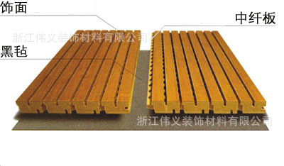 分类 木质吸音板分槽木吸音板和孔木吸音板两种,槽木吸音板是一种在密度板的正面开槽、背面穿孔的狭缝共振吸声材料;孔木吸音板是一种在密度板的正面、背面都开圆孔的结构吸声材料。两种吸音板常用于墙面或天花装饰。