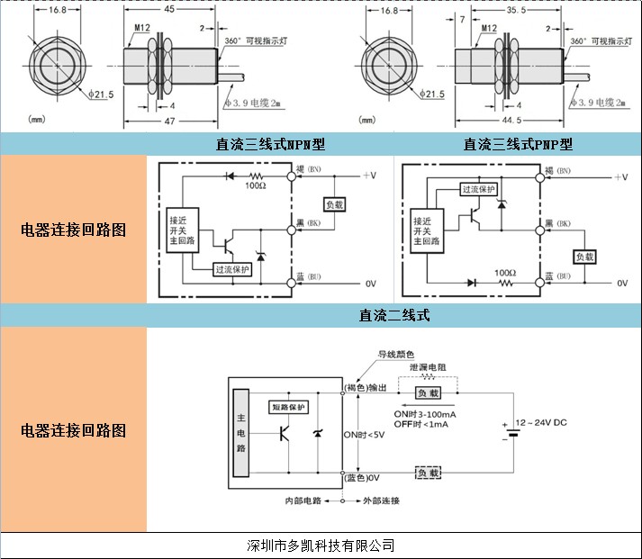 | 连接方式 | 截面积为0.3mm²的3芯导线,引出型(标准导线长2m或按要求定制)(导线耐曲折型)、 接插件型 |