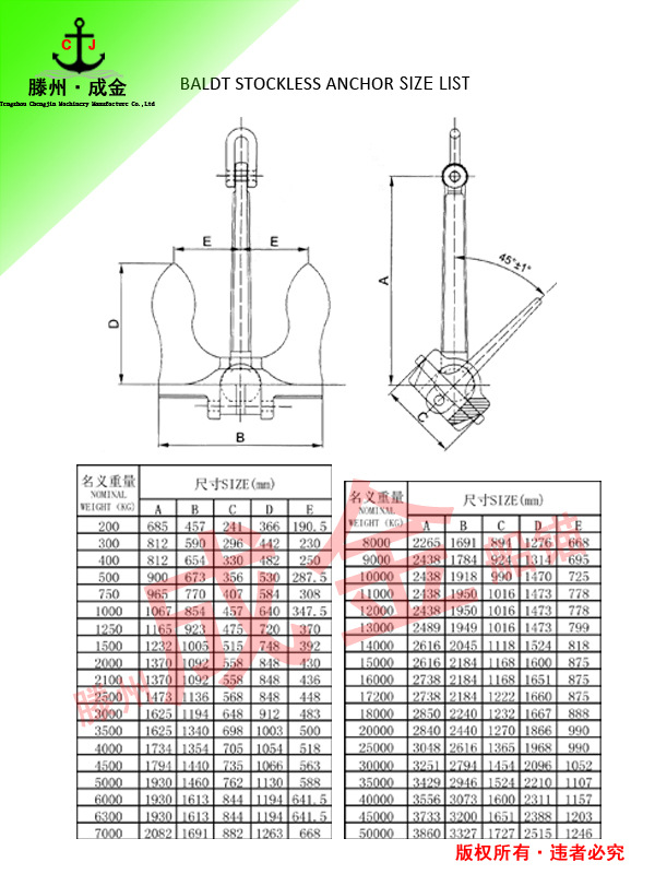 旗下铸钢锚产品有:斯贝克锚、海军锚、霍尔锚 A B C 型、日本无杆锚、AC-14大抓力锚;焊接锚产品有:波尔锚、德尔塔锚、CJ-12大抓力锚等船用锚;铸钢件产品有:DIN型导缆孔、U.S.型巴拿马导缆孔、闭式导缆孔、系泊式导缆孔、(A型)、西班牙导缆孔、巴拿马导缆孔(AC型)(BC型)、单点式导缆孔(A型)(B型)、船用小型制链器、导链轮、羊角单滚轮导缆器、系缆桩、焊接斜式导缆桩、船用铸钢件。
