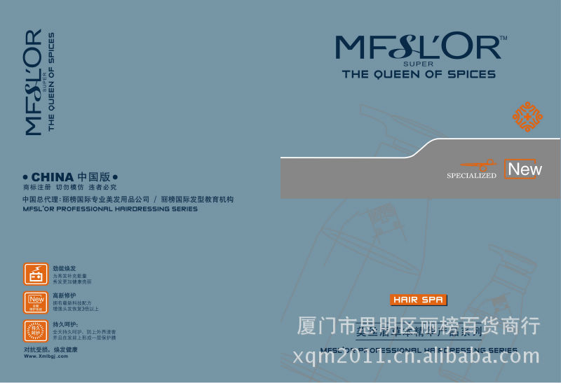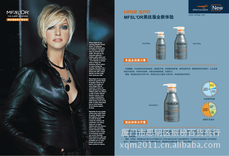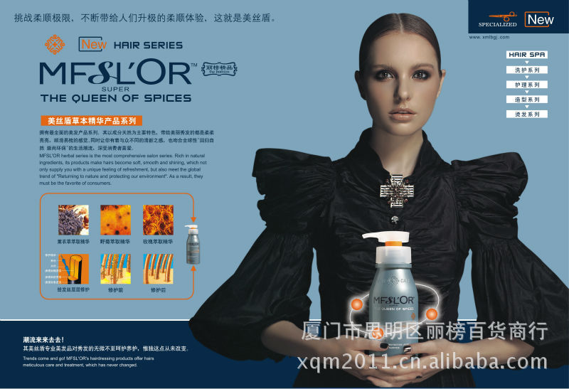 详细咨询产品 以及产品价格表请加QQ921549678 拥有最全面的美发产品系列。其以成分天然 为主要特色,带给美丽秀发的都是柔柔亮亮,顺滑易输的感觉,同时让你有着与众不同的清新之感,也吻合全球性“回归自然崇尚环保”的生活潮流,深受消费者喜爱。 mfslor herbal series is the most comprehensive salon series,rich in natural ingredients,its products make hairs become soft,smooth and shining,which not only supply you with a unique feeling of refreshment ,but also meet the global trend of"returning to nature and protecting our environment"as a result,they must be the favorite of consumers.