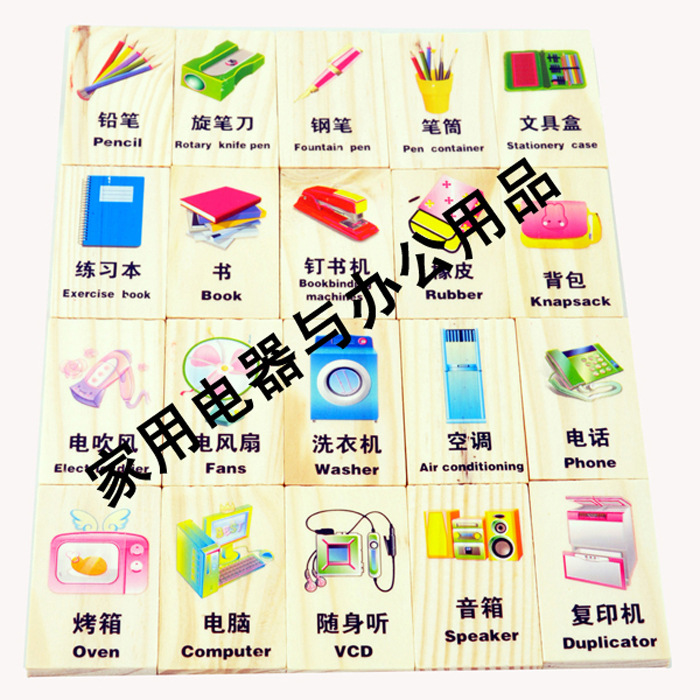 生活用品、交通工具、动物、家禽、水果、蔬菜、数字、几何形状、电器、学习用品。