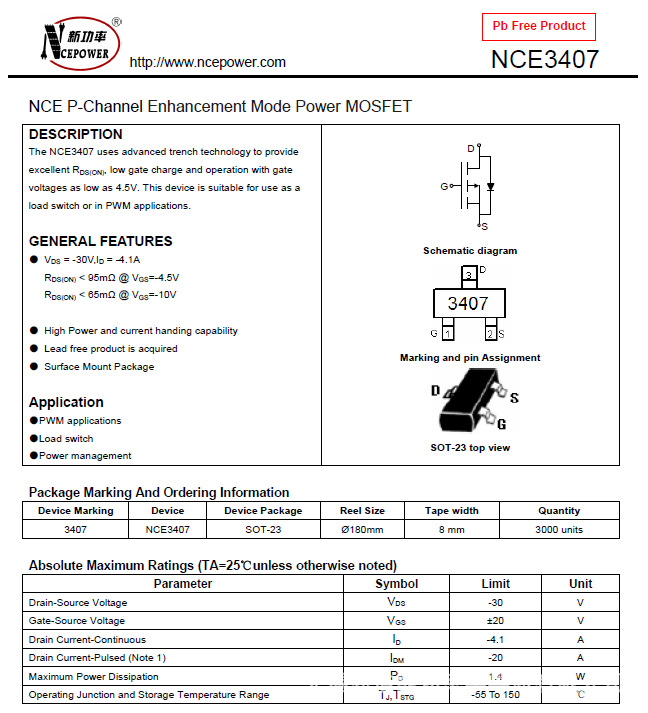 原厂供应NCE3407 场效应管 MOS管 -30V/-4.1A