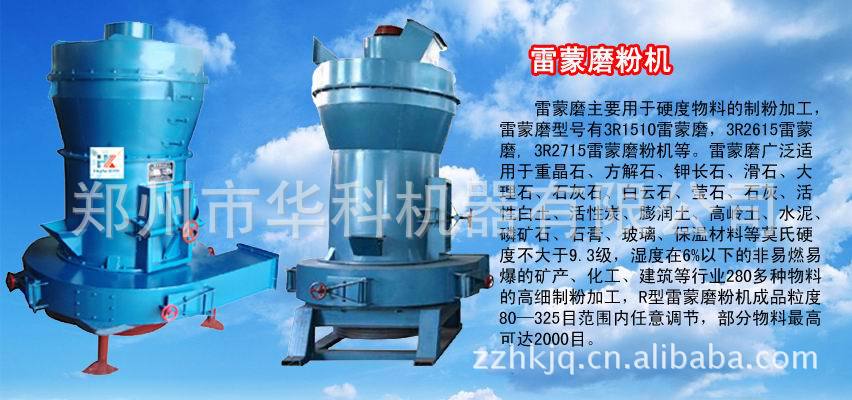 雷蒙磨粉机用途和使用范围:雷蒙磨粉机主要用于硬度物料的制粉加工,雷蒙磨型号有3R1510雷蒙磨,3R2615雷蒙磨, 3R2715雷蒙磨粉机等。雷蒙磨广泛适用于重晶石、方解石、钾长石、滑石、大理石、石灰石、白云石、莹石、石灰、活性白土、活性炭、膨润土、高岭土、水泥、磷矿石、石膏、玻璃、保温材料等莫氏硬度不大于9.3级,湿度在6%以下的非易燃易爆的矿产、化工、建筑等行业280多种物料的高细制粉加工,R型雷蒙磨粉机成品粒度80—325目范围内任意调节,部分物料最高可达2000目。