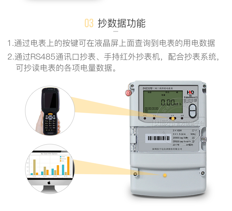 ② 通过手持红外抄表机,可读取电表的各项数据,包括每月、每小时、每分钟数据。