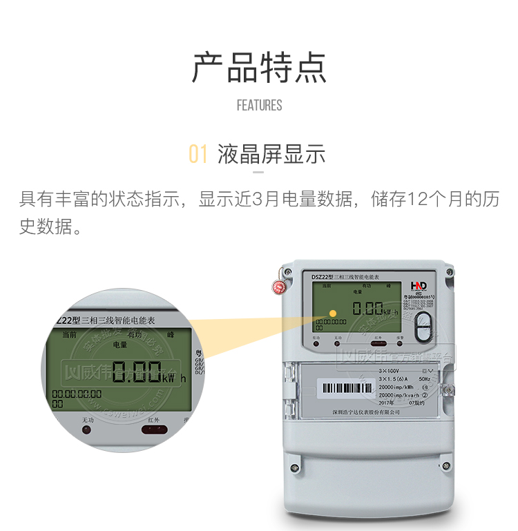 该表的主要特点是计量模块敏感度高(智能电表的计量模块由国家电网公司选型,已是目前国内电表最高标准水平),计量精准;该表电表行业大公司(深圳浩宁达仪表股份有限公司)生产,质量有保证,经过长期稳定运行,产品可靠性高。