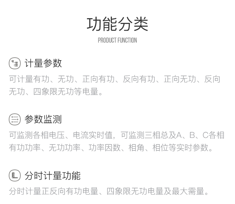 ① 计量参数:可计量有功、无功、正向有功、反向有功、正向无功、反向无功、四象限无功等电量。