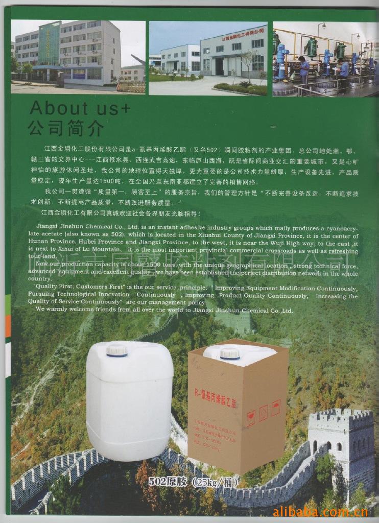 本公司主要生产502原胶、稠胶、特种胶、鞋用胶、金属胶、磁材胶低黄低白胶等胶粘剂产品。