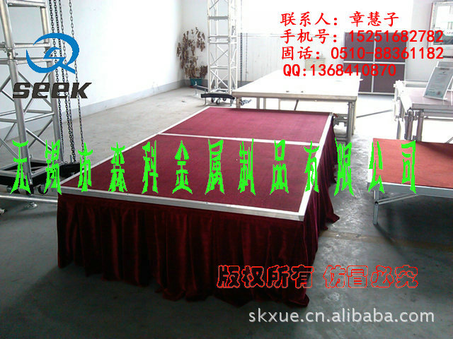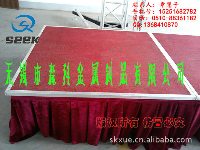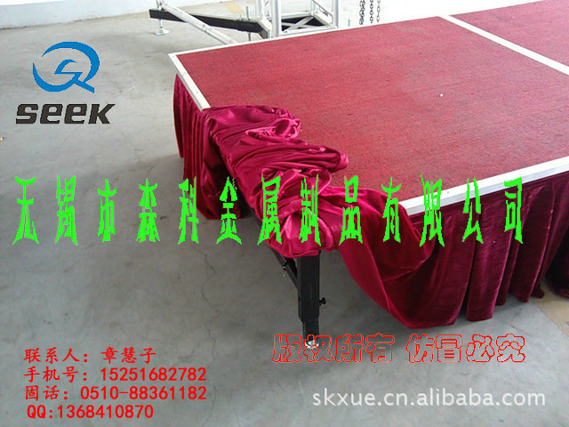 无锡森科金属制品公司是一家专业设计,生产和销售为一体的舞台设备公司。包括各种规格型号的钢铁舞台(国家专利斜拉式钢铁舞台、雷亚架钢铁舞台、卡扣式钢铁舞台,折叠钢铁舞台)、拉网舞台,铝合金舞台、玻璃舞台、钢铁桁架(舞台背景架,广告架、喷绘架、展示架)、铝合金桁架、TRUSS架(铝合金灯架、舞台灯光架、舞台支架、展览架)等,高度及尺寸可根据客户要求订做。亦承接工程安装、会展特装、车展、室内外展棚搭建等。公司自成立以来,以优质的产品,诚信合作的理念,服务于海内外客户朋友,产品远销美洲、欧洲、非洲、中东等地区及台湾,香港地区。