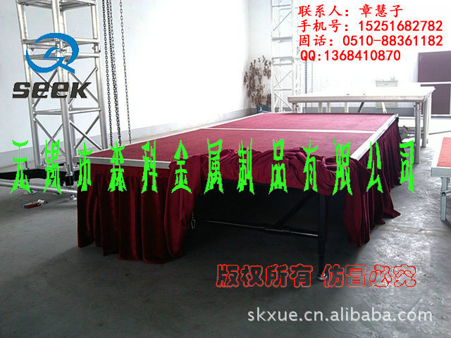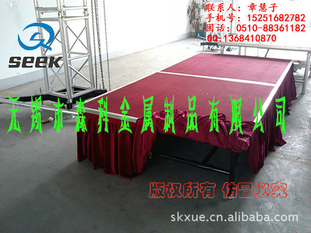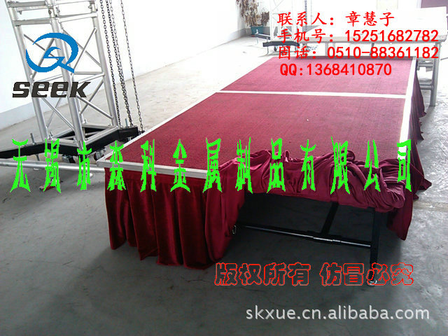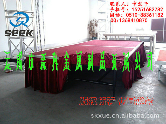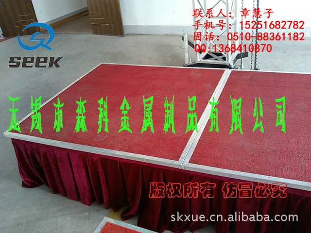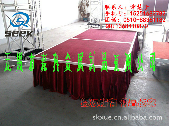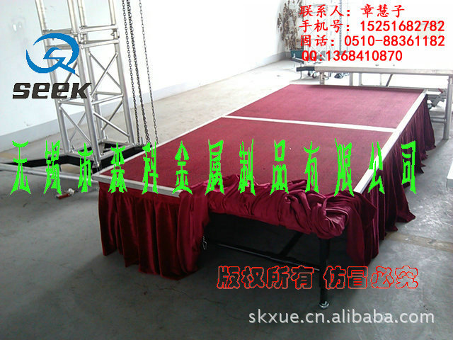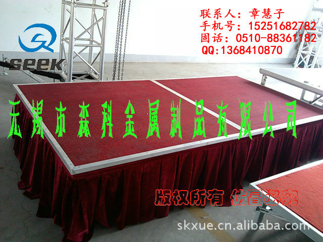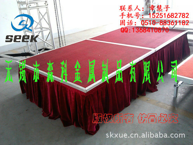 无锡森科金属制品公司是一家专业设计,生产和销售为一体的舞台设备公司。包括各种规格型号的钢铁舞台(国家专利斜拉式钢铁舞台、雷亚架钢铁舞台、卡扣式钢铁舞台,折叠钢铁舞台)、拉网舞台,铝合金舞台、玻璃舞台、钢铁桁架(舞台背景架,广告架、喷绘架、展示架)、铝合金桁架、TRUSS架(铝合金灯架、舞台灯光架、舞台支架、展览架)等,高度及尺寸可根据客户要求订做。亦承接工程安装、会展特装、车展、室内外展棚搭建等。公司自成立以来,以优质的产品,诚信合作的理念,服务于海内外客户朋友,产品远销美洲、欧洲、非洲、中东等地区及台湾,香港地区。