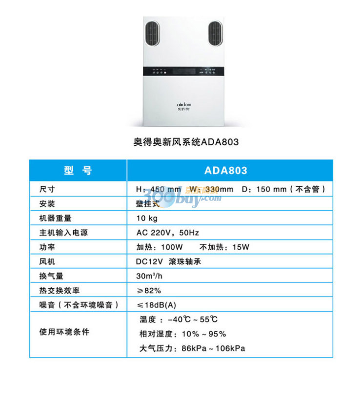 奥得奥(airdow)新风系统 ADA803空气净化器 壁挂式 上出风 冷热交换系统 除PM2.5