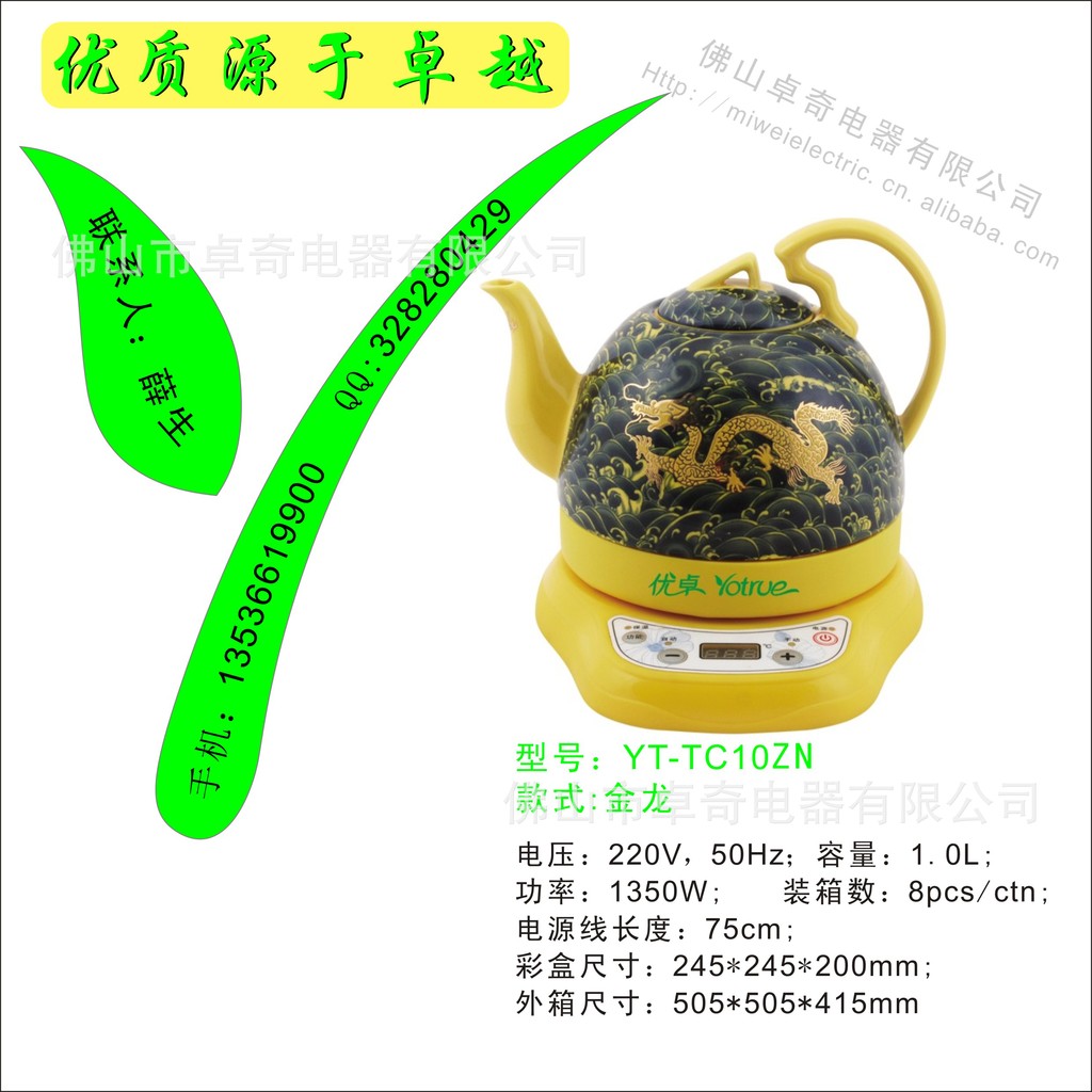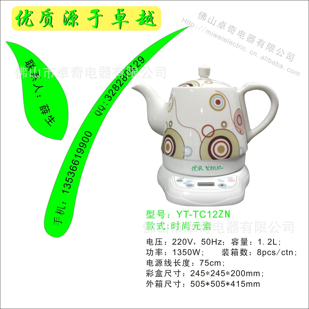 A --额定输入电压为220V,50HZ; B --额定输入功率为1000W; C --额定容量为:1.0L~1.2L; D --快速饮水时间-4-6分钟; E --环保陶瓷材料+不锈钢发热盘; F --电源线长度为75 CM; |