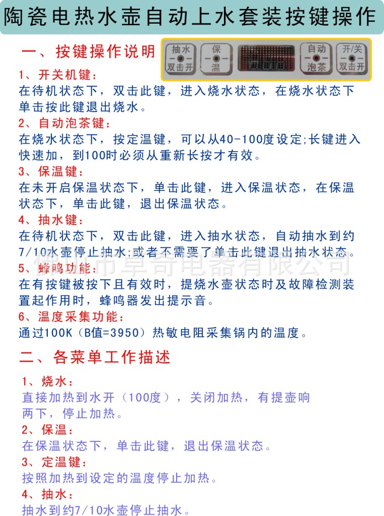 **优卓牌陶瓷电热水壶自动上水套装** 应用真空压抽水技术,只需放上水管与桶装水相连,轻轻双击面板底盘功能键,即可实现自动上水、加热、泡茶、保温等功能;遵从人体工程学而设计,轻松享受现代小家电的便捷、舒适,品悠然之茶茗,尽享其乐无穷! 当亲朋好友来访时,使用优卓自动上水陶瓷茶具,不必频繁离座加水而怠慢客人,只手指轻轻一按,轻松搞掂! 您所需要的都替您想到了!您的满意就是我们的追求!厂家直销,省去中间多重环节,确保亲们买回的绝对是物美价廉的宝贝! 物流/快递说明 物流/快递根据不同的城市和区域,发货时自行通知客户及具体到货时间和物流/快递单号 |