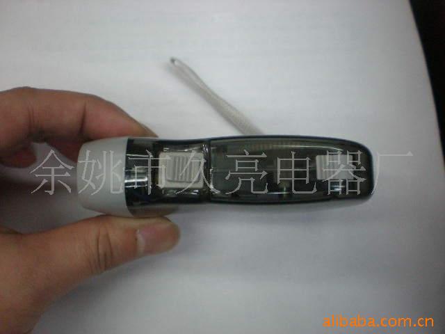 一、功能特点:1、 使用2颗LED灯,寿命长。2、 高效节能,通过机械传动产生电能,点亮LED灯。3、 小巧玲珑,配置挂绳,便于携带、使用方便,适合于野营、旅游、越野、探险、家居之用。永远不会再因为停电而慌乱。二、操作说明:1、 将产品置于手中,把卡钩推向尾端,发电推柄会自动弹出。2、 将电源转换开关置于下端(出厂默认端)。3、 用手反复握压发电推柄,即可产生电势,点亮LED灯。4、 将发电推柄归位,用卡钩卡住。5、 将电源转换开关置于上端,此时内置电源供电,点亮LED灯,可持续点亮十小时。6、 使用完毕,请将发电推柄归位,用卡钩卡住,电源转换开关置于下端。