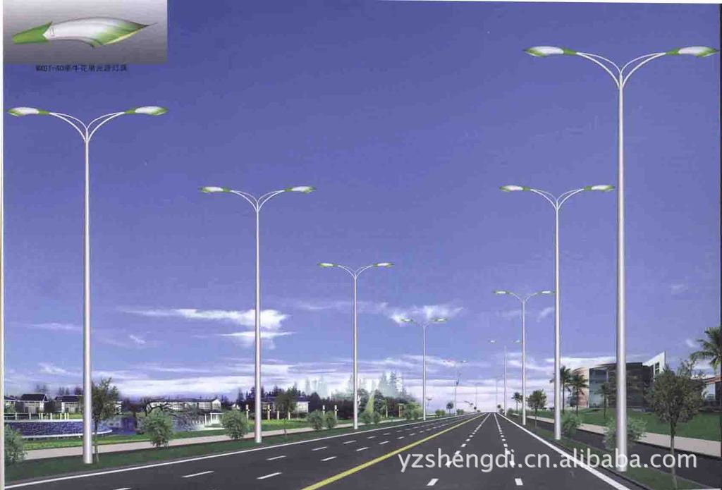 2、牵牛花型路灯灯具为压铸铝,经喷砂弹丸处理后,表面聚酯粉体涂装。 灯杆插入口径为直径60管,牵牛花(大)插入深440mm,(小)插入深360mm。