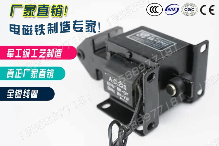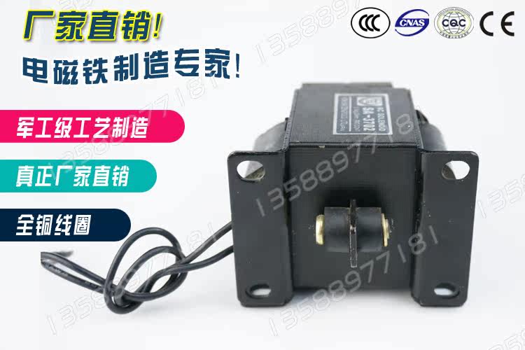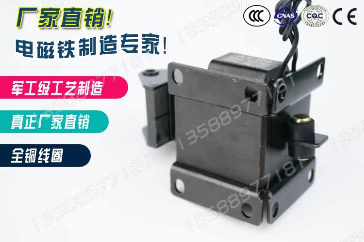 电磁铁是由磁轭和衔铁两部分组成,在使用时,将磁轭孔安装在固定支架上面,将衔铁活动的连接于牵引杆上。当吸引线圈通电时衔铁被吸合,经过连杆带动其所控制的机构。