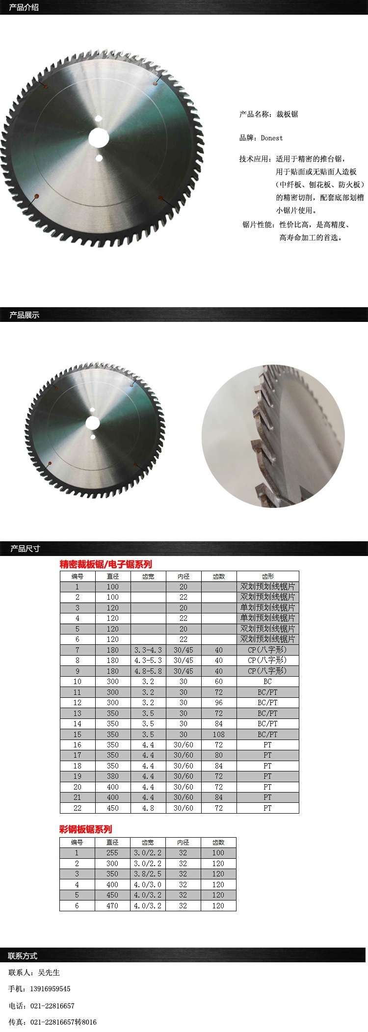 305*3.2/2.2*65*120T,280*3.2/2.2*25.4*120T(以上产品有3左1右,3右1左,五齿组,左右齿)适用于多层板,细木工板,集装箱地板,木地板等产品的裁边锯切。300*3.2/2.2*30*72T,300*3.2/2.2*30*96T,350*3.5/2.5*30*96T,350*3.5/2.5*30*108T,400*3.5/2.5*30*96T,400*3.5/2.5*30*108T,以上产品适用于家具厂锯切刨花板,三聚氰胺贴面板。