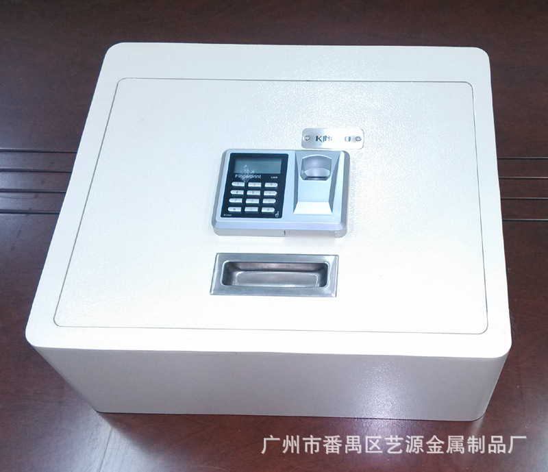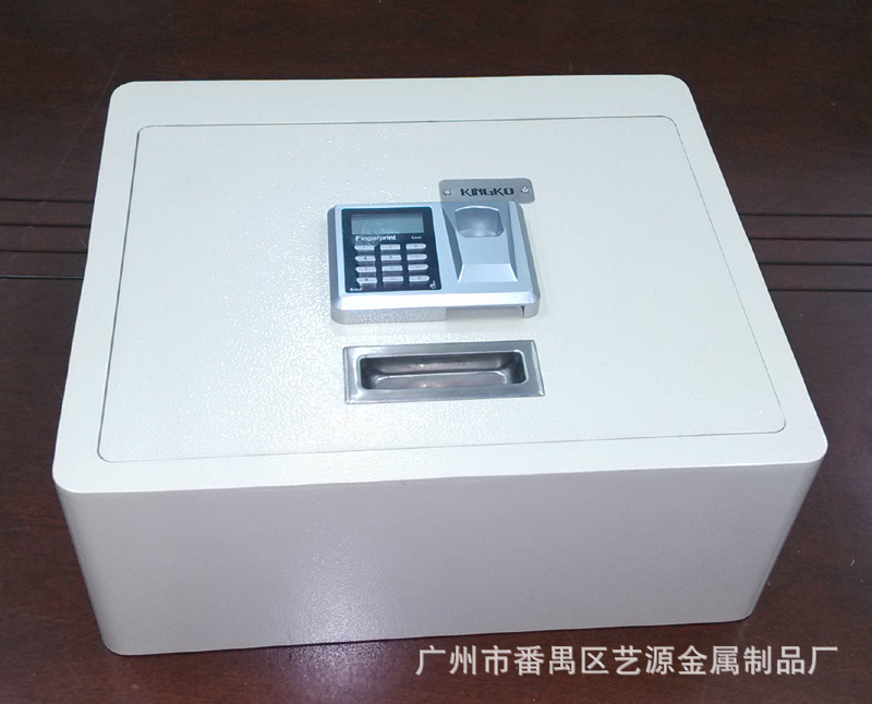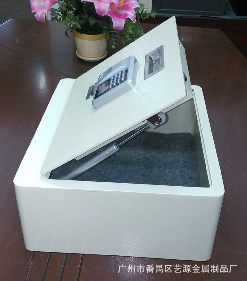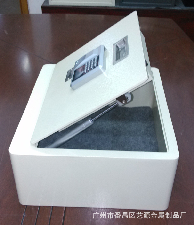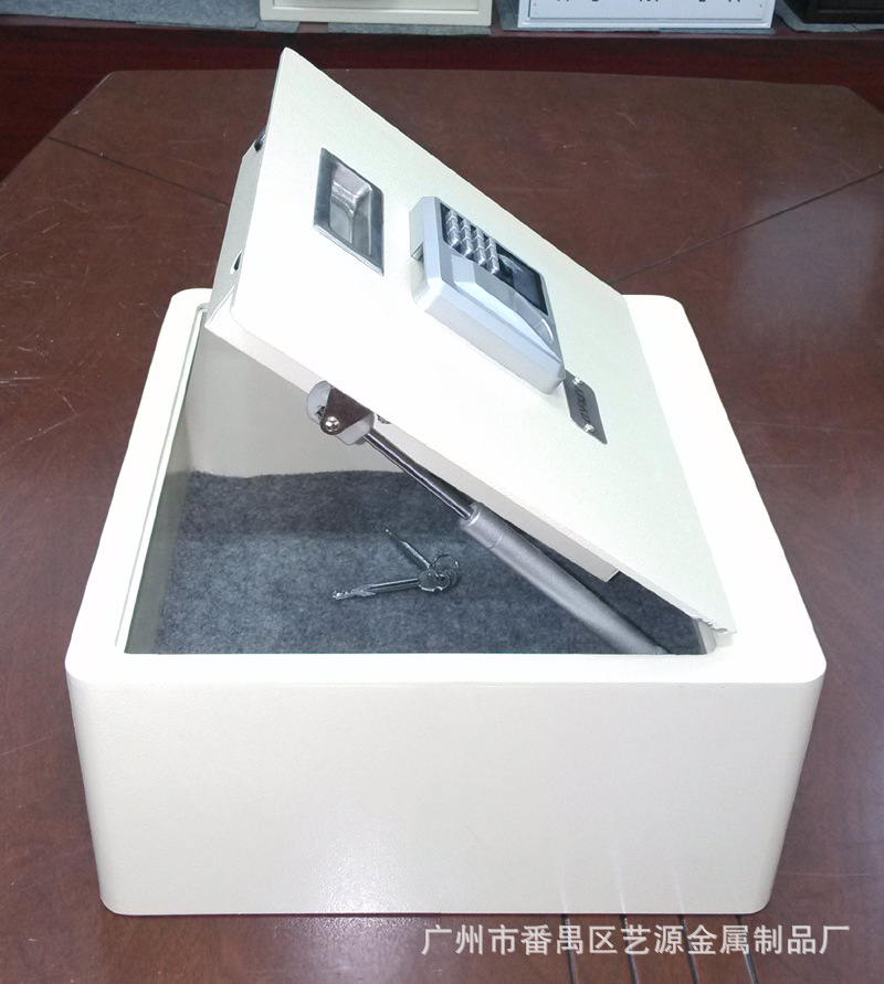 翻盖式保险箱,内有两支气杆支撑,打开时不费力,轻轻一拉,气杆向上顶。表面配的是指纹加密码两用锁,安全可靠。并配有应急钥匙,在密码错误、电池没电时可用钥匙打开。(注:客户在收到货试用时,请务必先将箱内的应急钥匙及说明书拿出后再试用。)