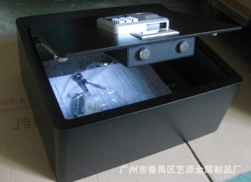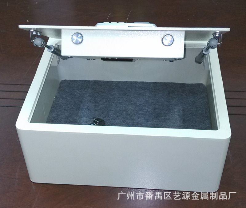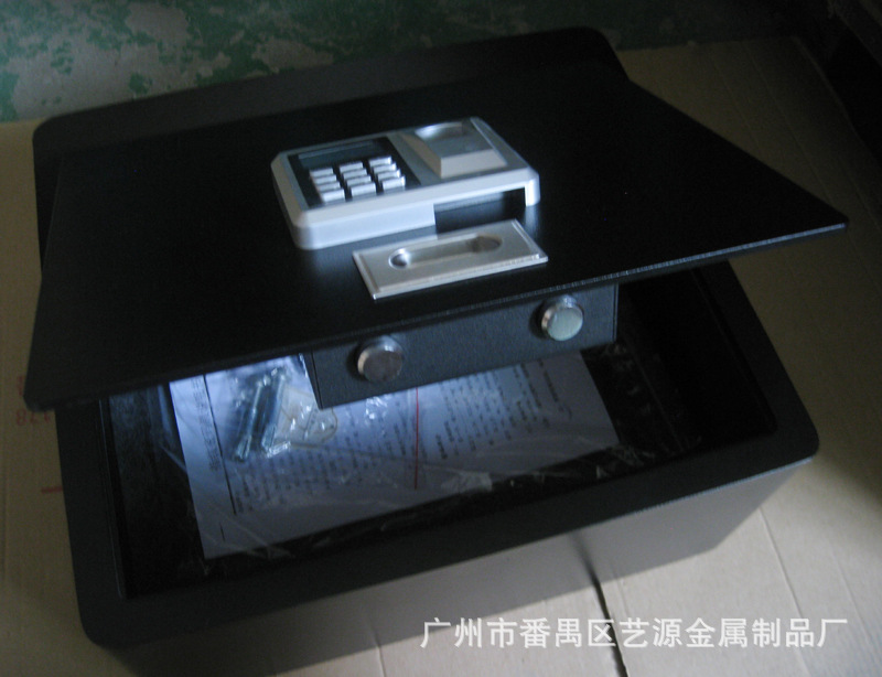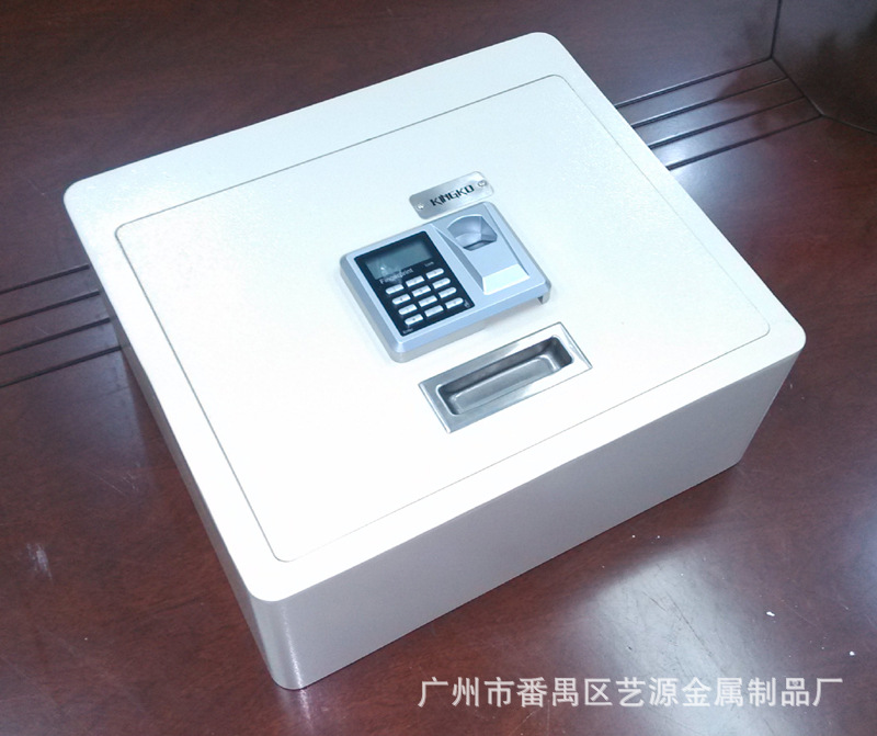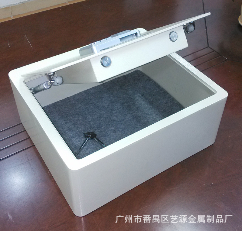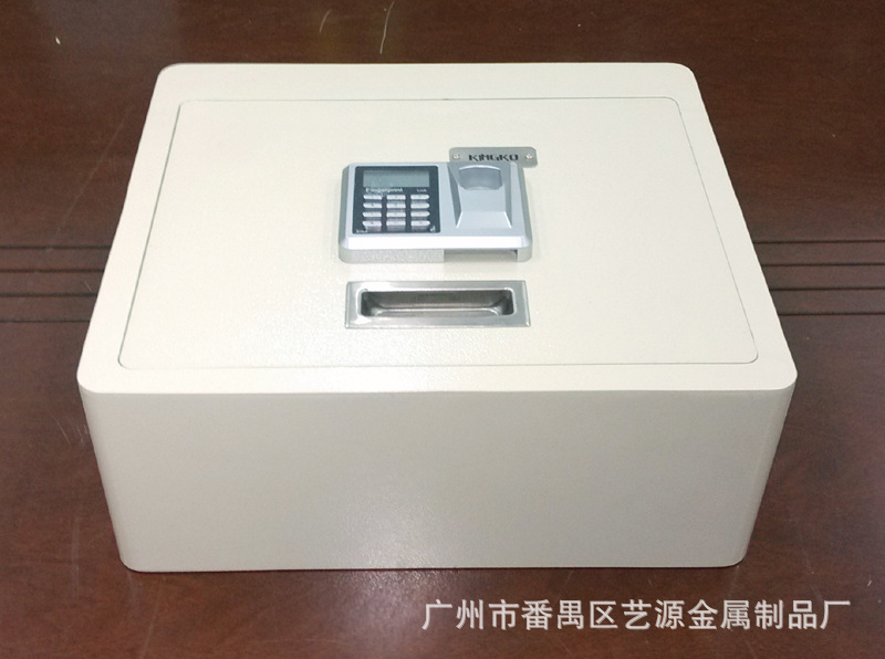 翻盖式保险箱,内有两支气杆支撑,打开时不费力,轻轻一拉,气杆向上顶。表面配的是指纹加密码两用锁,安全可靠。并配有应急钥匙,在密码错误、电池没电时可用钥匙打开。(注:客户在收到货试用时,请务必先将箱内的应急钥匙及说明书拿出后再试用。)