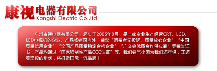 关于我们 我公司(广州市康视电器有限公司)是八年诚信通用户,以诚为本,以质为根,所有液晶电视/显示器等都通过国家3C认证,符合行业标准,旗下品牌“康视宝”更是阿里巴巴官方认证的优质品牌,是阿里最受欢迎的家电品牌之一。(点击这里查看康视宝品牌阿里官方认证页面)