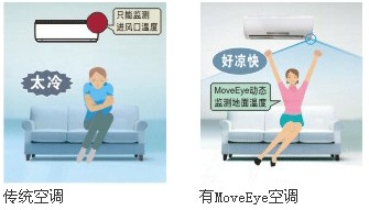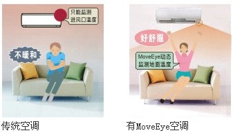 MoveEye能够自动探测到室内温度不均匀的区域,空调则即时对该区域集中送风,使房间始终保持温度均匀,消除了由于室内温度不均而带来的不适感。 | |