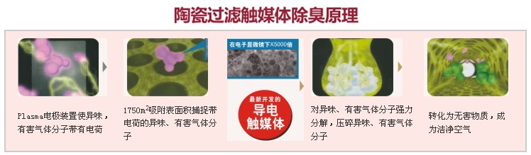 ![]() | 陶瓷过滤器中,含有新开发的纳米级微孔锰触媒,只有10公分大小的陶瓷过滤触媒体的吸附表面面积从设计理论上达到1750m2,充分捕捉、分解异味分子和有害气体分子。 |