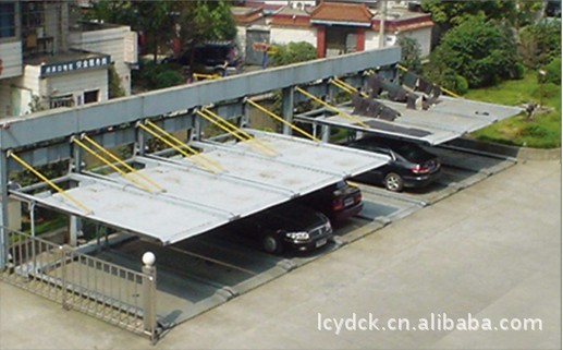 该停车设备的出入口在层,最高层的停车板只可做升降动作,层的停车板只可做横移运动。中间两层停车既可作升降动作又可做横移动作。下上层均设有空位,停车板通过横移动作变换空位,降下空位上方的汽车,取出汽车,层汽车无需倒车,便可直接开出。