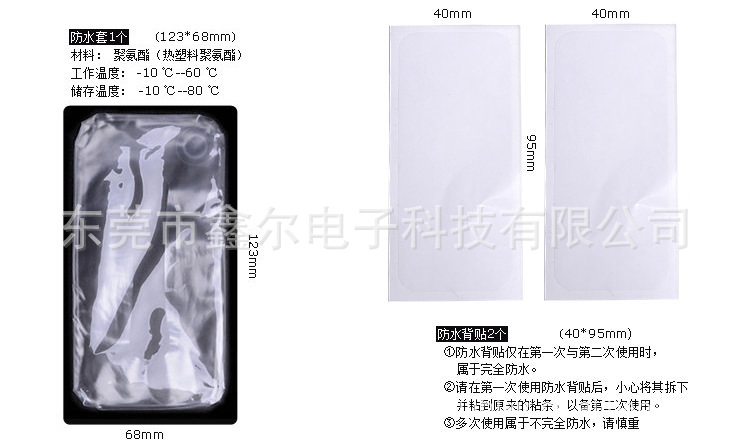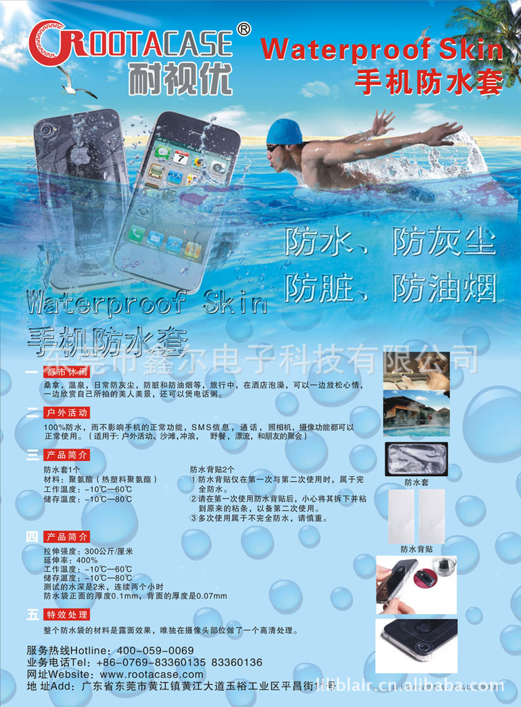 东莞鑫尔电子推出的耐视优品牌手机防水保护套是2012年最新款手机防水套,采用韩国进口聚氨酯(热塑料聚氨酯)材质制作而成拉伸强度:300公斤/厘米,延伸率:400%工作温度:-10℃—60℃储存温度:-10℃—80℃测试的水深是2米,连续两个小时,防水袋正面的厚度0.1mm,背面的厚度是0.07mm,耐视优品牌iphone4手机防水套2012年夏季热销全球,你值得拥有。