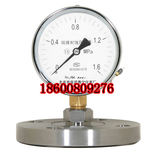产品结构原理:隔膜式压力表采用间接测量结构,适用于测量粘度大、易结晶、腐蚀性大、温度较高的液体、气体中颗粒状固体介质的压力。隔离膜片有多种材料,以适应各种不同腐蚀性介质。