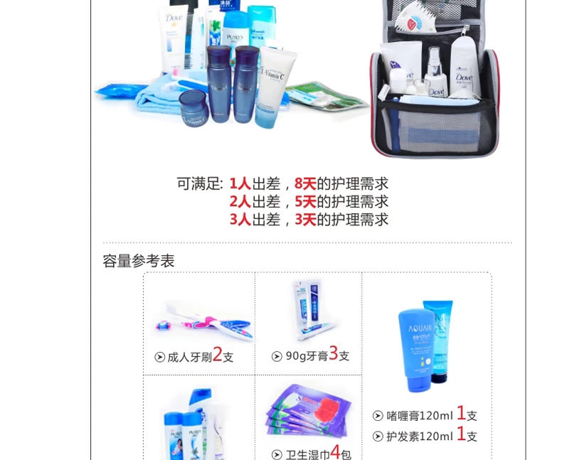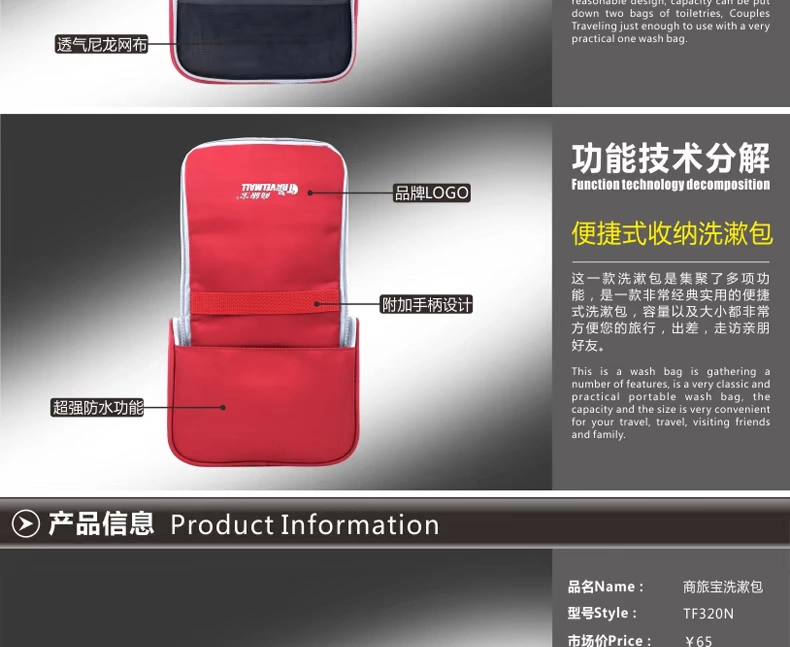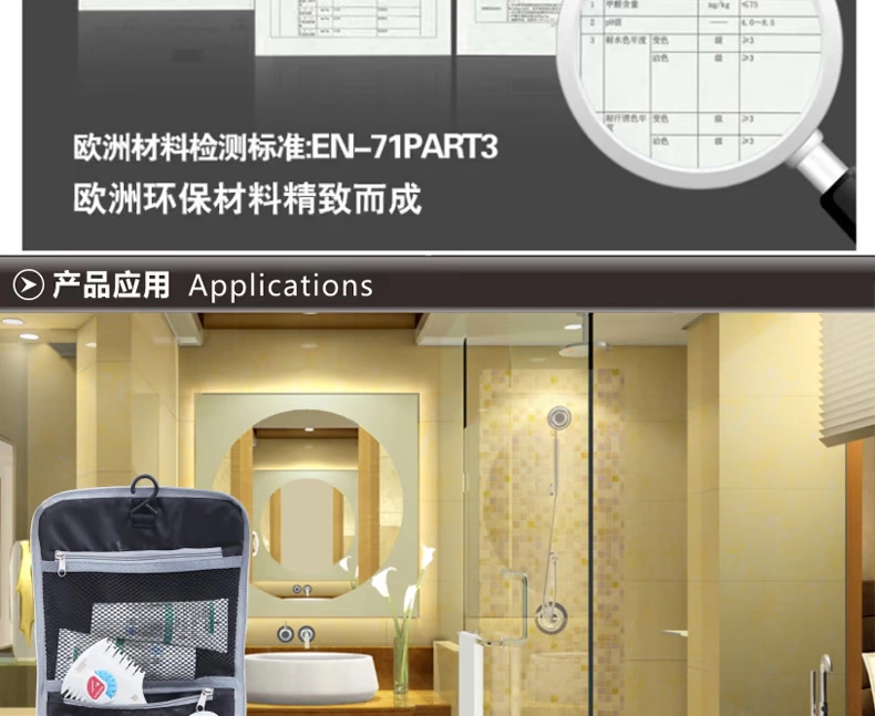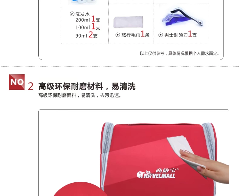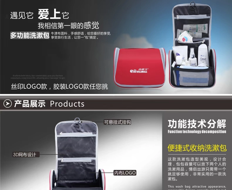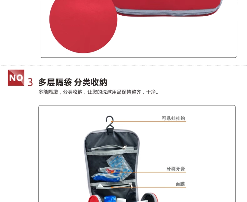 1.2:此三个包可根据你的需要,完全DIY任意组合;也可合并或分开使 用:按我们设计师设计时的意图,其使用方法(包括但不限于如下): 1.21:洗漱包如果一个人出差旅行壹天,就带一个小包。 1.22:如果一个人出差旅行两天,就把左右两个小袋合起来使用。 1.23:如果一个人出差旅行三到五天,就带中间哪个大包。 1.24:如果是你一家人或是你小两口一起出去TRAVEL,就带上三个完全 洗漱包生产厂家,洗漱包供货商 组合好的大团包;又称为情吕组合包,可将一个小包放一些女人 专用的卫生纸等女性专用包,另一个小包可收纳一些男人用的专 用品包;而中间这个大包,就收纳一些你俩口的共用品。