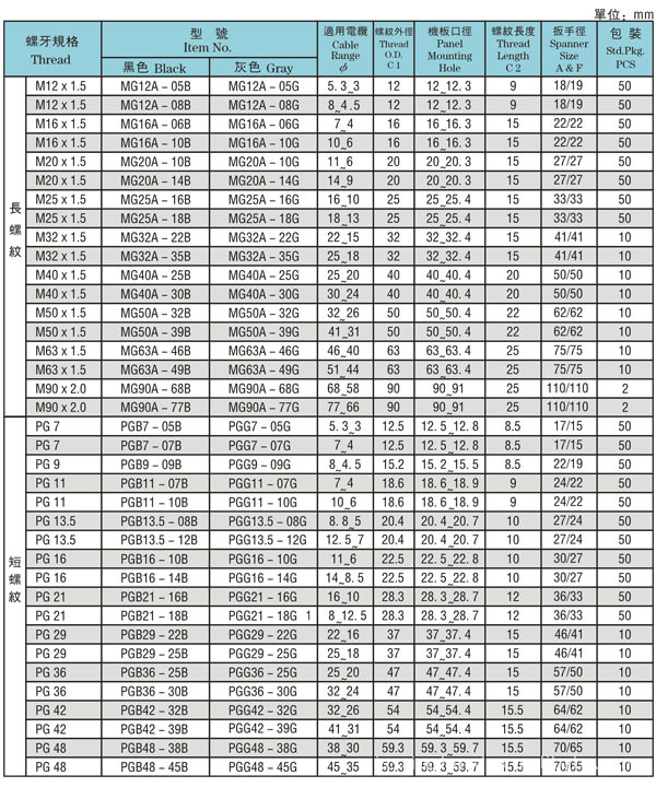 规格:公制牙(Metrlc)、G(PF/BSF/PS) 牙、PG 牙及NPT 牙。