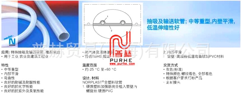 产品名称:NORPLAST PVC 388 SUPERELASTIC产品特性:抽吸和输送管; 中等重型,内壁平滑, 低温伸缩性好