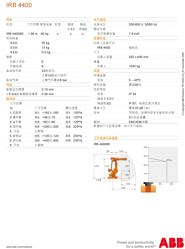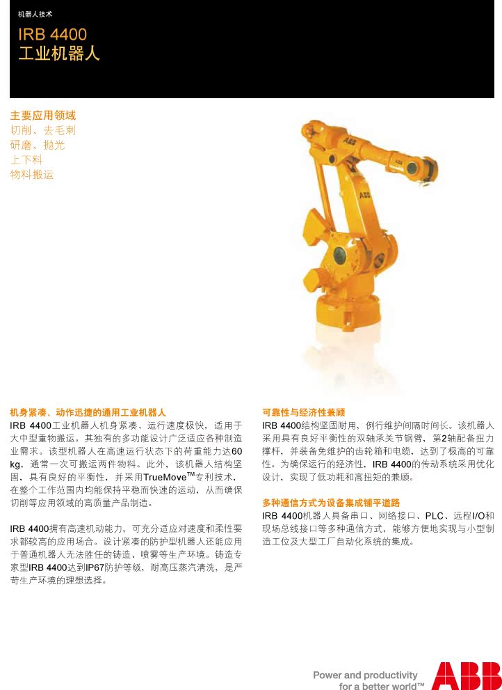 IRB 4400是一种机身紧凑的机器人,可承受载荷最高可达60kg。 除此之外,全能的IRB 4400能胜任各种高精度、高速度和高灵活性的应用。