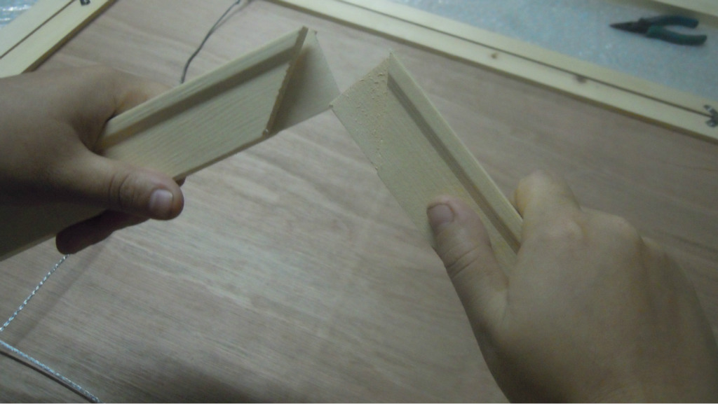 好,第二步,像下图所示,两手从外向内用力,将榫片按开好的槽位放进去,刚开的新框通常,榫位那里都比较紧,可以上下轻摆框条往内压,也可以用钉锤在框的外侧,对准榫头的位置,适当用力向下敲……