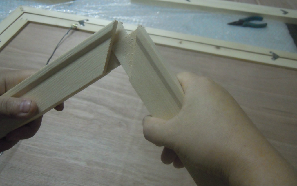 第三部:继续像内敲压框条,主要不要过重用力,损坏到框条表面,直到让角位紧密,侧边榫头与边框平为止。