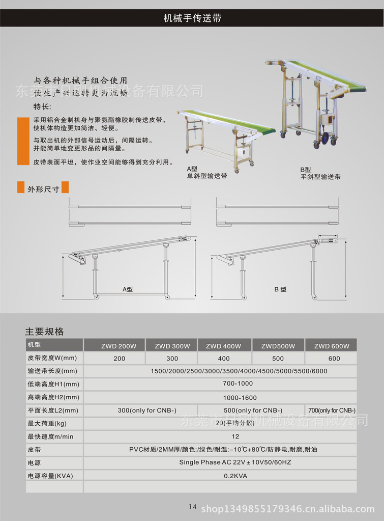 我司该系列的传送带是与注塑机械手配套使用。该系列传送带有各种机型ZWD200W、ZWD300W、ZWD400W、ZWD500W、ZWD600W,其分别代表不同皮带宽度。具体的参数及图片如下: