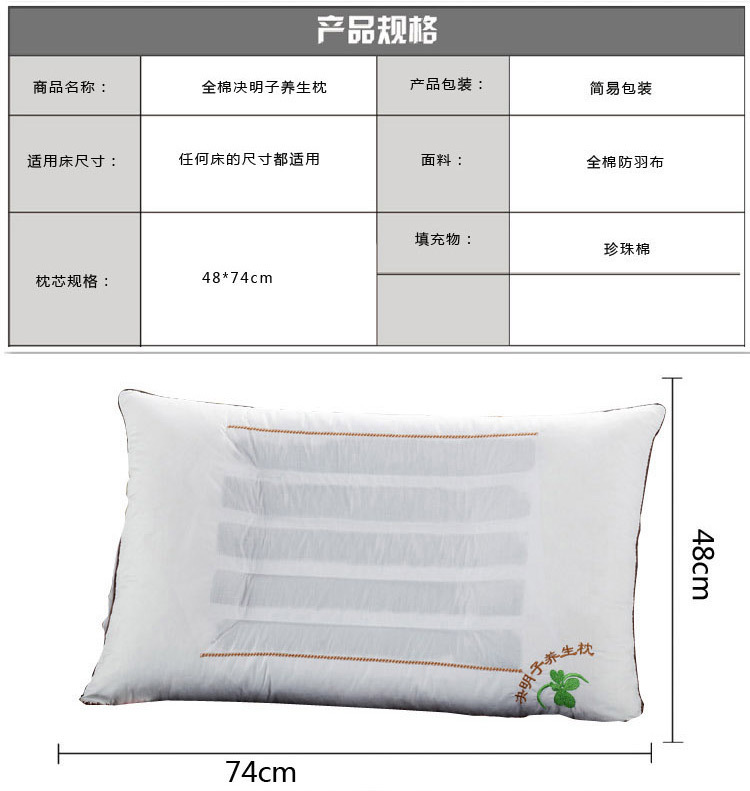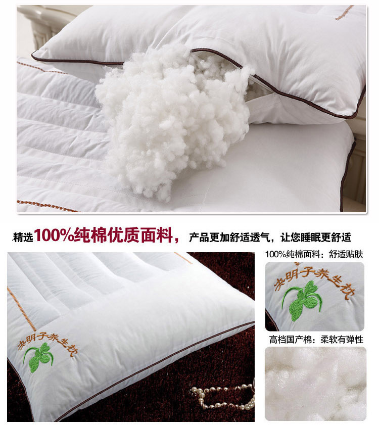 本款决明子枕头精选木棉决明子为填充料,经高新技术处理与珍珠棉纤维的巧妙结合。木棉性凉,味甘淡,有祛风除湿,活血消睡,散节止痛等功效而且木棉状似棉花,保暖更佳,自古人们就把木棉作为枕被的填充料,决明子有散风清热,清肝明目,健脑安神之功效。把决明子,木棉花加入枕心, 令您在睡眠时得到天然芳香理疗保健。