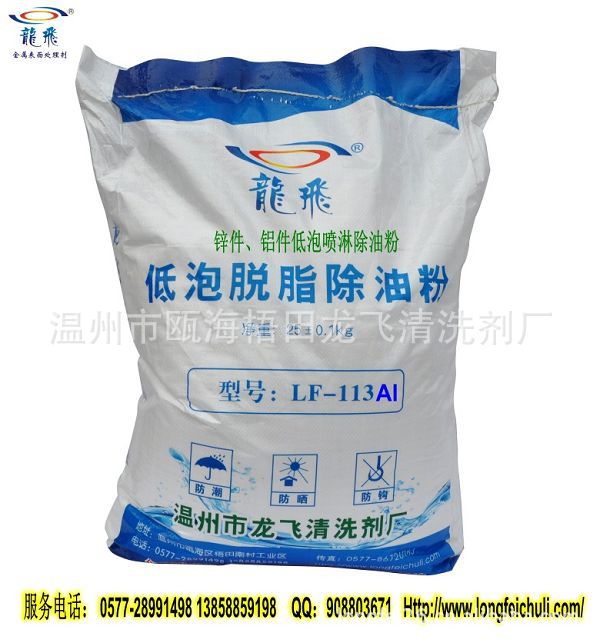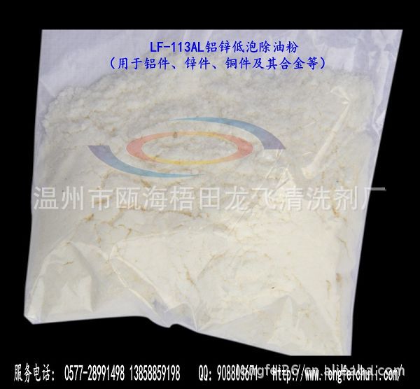 | LF-113Al铝锌低泡除油粉 应用说明 本品是新型高效低温低泡除油剂,它是由多种具有自消泡活性剂并且乳化、增溶、渗透分解能力强的原料科学配制而成,可在超低温状态下迅速除去铝材、锌材、镀锌板、铜材以及其合金等金属表面的皂化油、矿物油、拉伸油等,具有不腐蚀金属、浸透力强、低泡、污染小、水洗性能好、使用寿命长、成本极低等特点,浸渍、喷淋、擦洗均可,亦适用于玻璃、塑料、陶瓷、橡胶等非金属表面的除油去污。 主要特点 ●本品使用单一制剂,配制槽液容易,溶解性好、浸透力强,无沉淀,易水洗,操作方便,管理简单;能快速将金属表面的动物油、植物油、矿物油除去,处理后的工件表面可形成连续的水膜。 ●本品以水作溶剂,低泡,不含毒性物质,不产生有害气体,可循环反复使用且使用寿命长,综合成本低,劳动条件好,环保好。 技术指标 序 号 | 项 目 | 指 标 | 1 | 性 状 | 白色粉末,弱碱性 | 2 | 配 比 | 3.0~ 8.0 % | 3 | 使用方式 | 常温 ~ 65℃条件下浸渍、喷淋、擦洗、超声波清洗 处理时间为2min ~ 30min | 4 | 处理槽体或 喷嘴材质 | 槽体可采用低碳钢制造(内有防腐衬里),交换器和喷嘴使用不锈钢,配管和泵可用不锈钢制,可减轻维修工作; | 5 | 游离碱度: | 7.5~ 12.5 |
