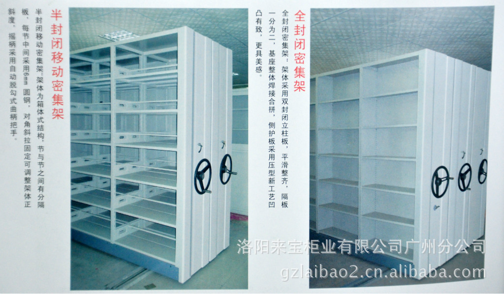 我公司“洛来宝”牌移动全封闭图书密集架。严格按照国家档案局DA/T7—92《直列式档案密集架行业标准》和GB/T13667.3-2003《手动密集书架技术条件》组织生产,产品磷化处理工艺符合GB6807-86国家标准,并取得ISO9001质量体系认证和ISO14001环境管理体系认证。具有防毒、防蛀、防尘、防光、防鼠、防盗、防火等功能。